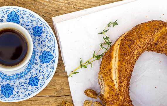 A simit is a circular-shaped bread with sesame seeds on top. They are typically a little bit chewy but have a lovely taste due to the molasses used in baking. They are ideal if you are looking for something plain but satisfying when you are out and about.