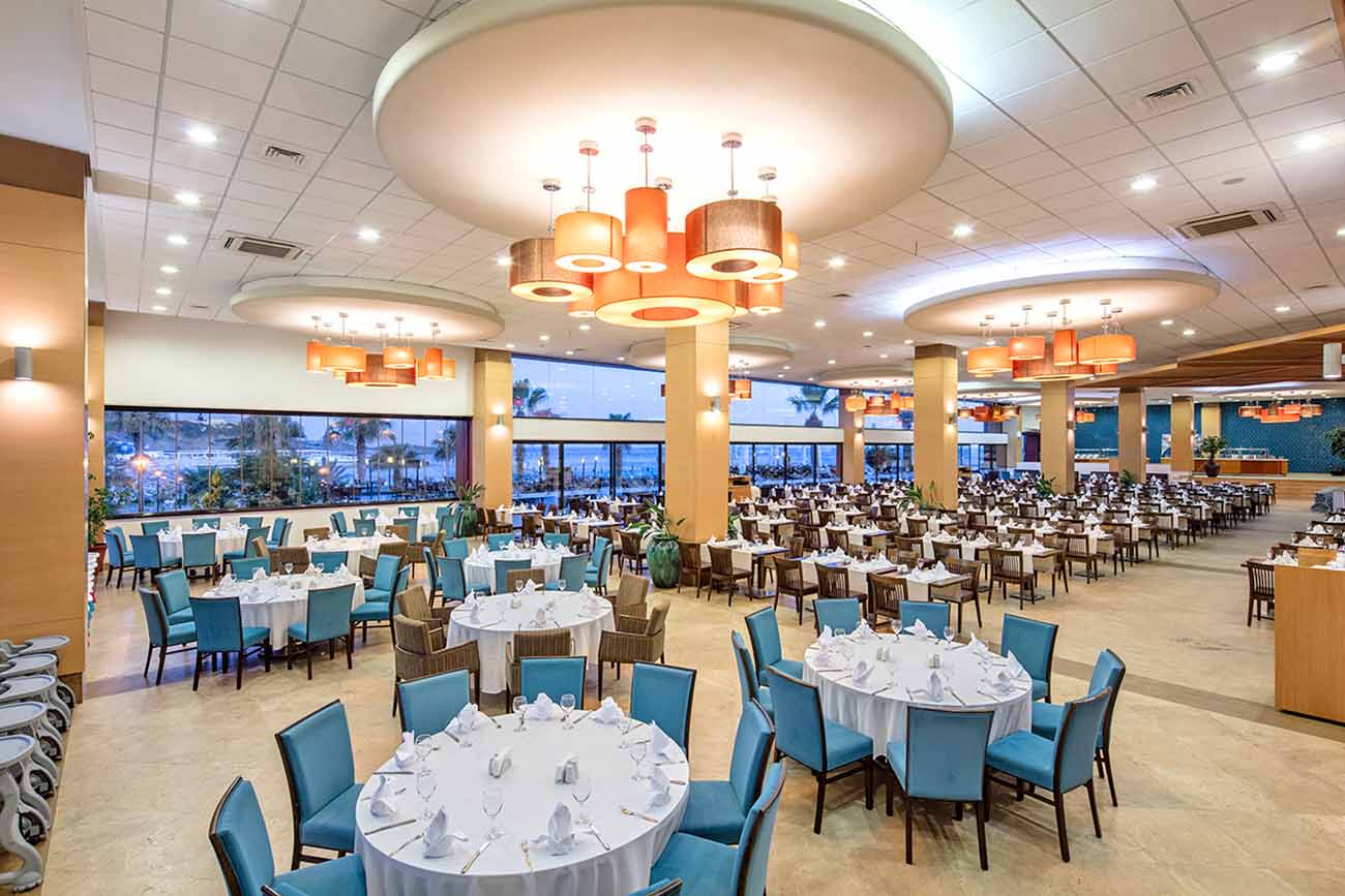 The hotel offers an impressive range of dining options to suit every taste. The Sunset Restaurant serves as the main buffet, while a variety of à la carte options are available, including Maza Ocakbasi (grill/meat), Roqa (fish), Sea Side À La Carte at the beach, and the Bistro in the lobby of the Olive Court building. But that's not all - there are plenty of bars to choose from as well. Enjoy the cosy Lobby Bar, La Femme Lounge, Moqa Sports Bar, and the luxurious Cigar Bar, all open year-round. For a change of scene, the Pine Court building features two lobby bars. In summer, additional options like the Beach Bar, Aqua Restaurant, and Moonrise Restaurant by the lively aqua park add even more variety.