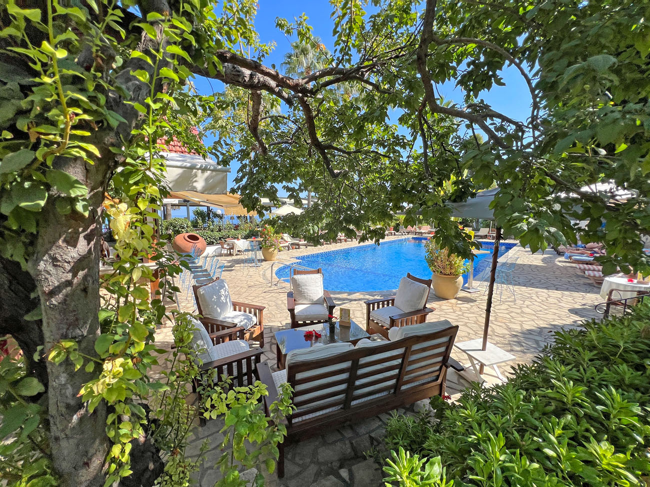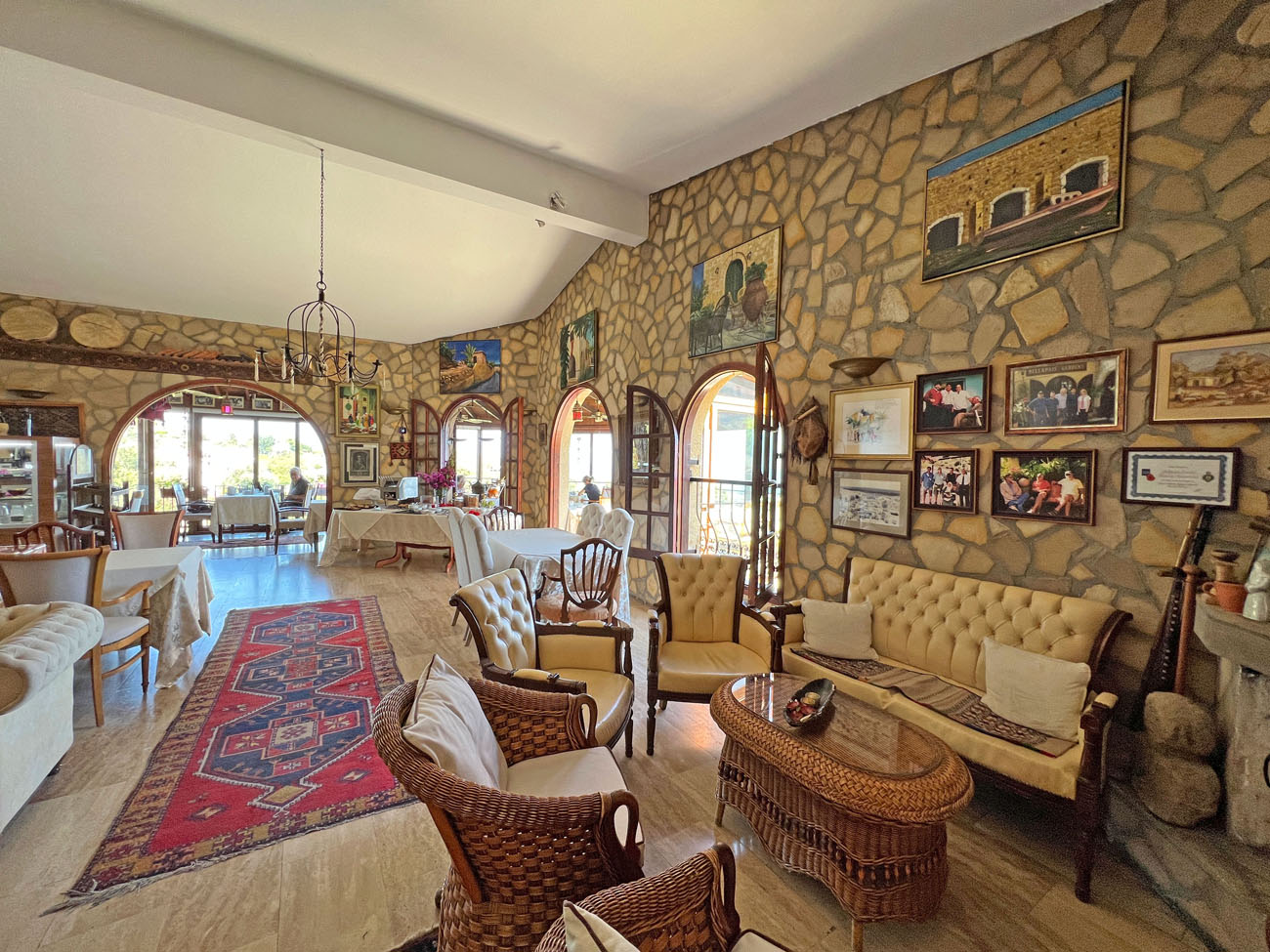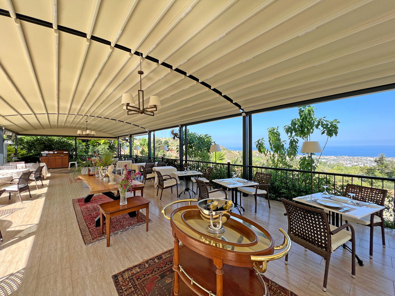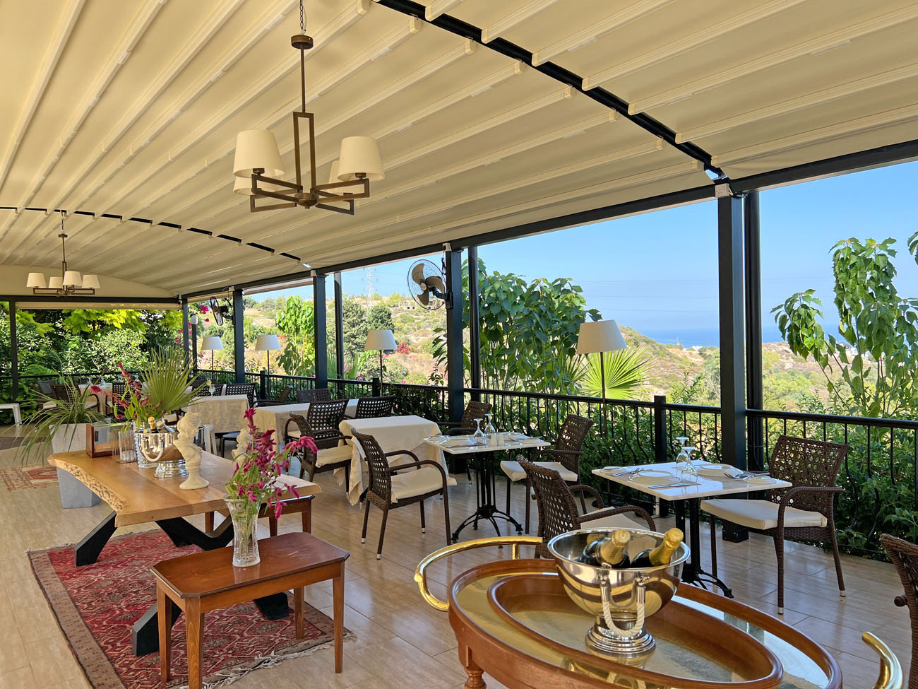 The restaurant and lounge, a treasure trove of local antiques and bric-a-brac, are at the highest point, with beautiful views down over the surrounding countryside to the distant Mediterranean. Breakfast is served as an open buffet and with a choice from the menu, including full English and omelette. Lunch and dinner are served a la carte. The restaurant bar is open throughout the year.