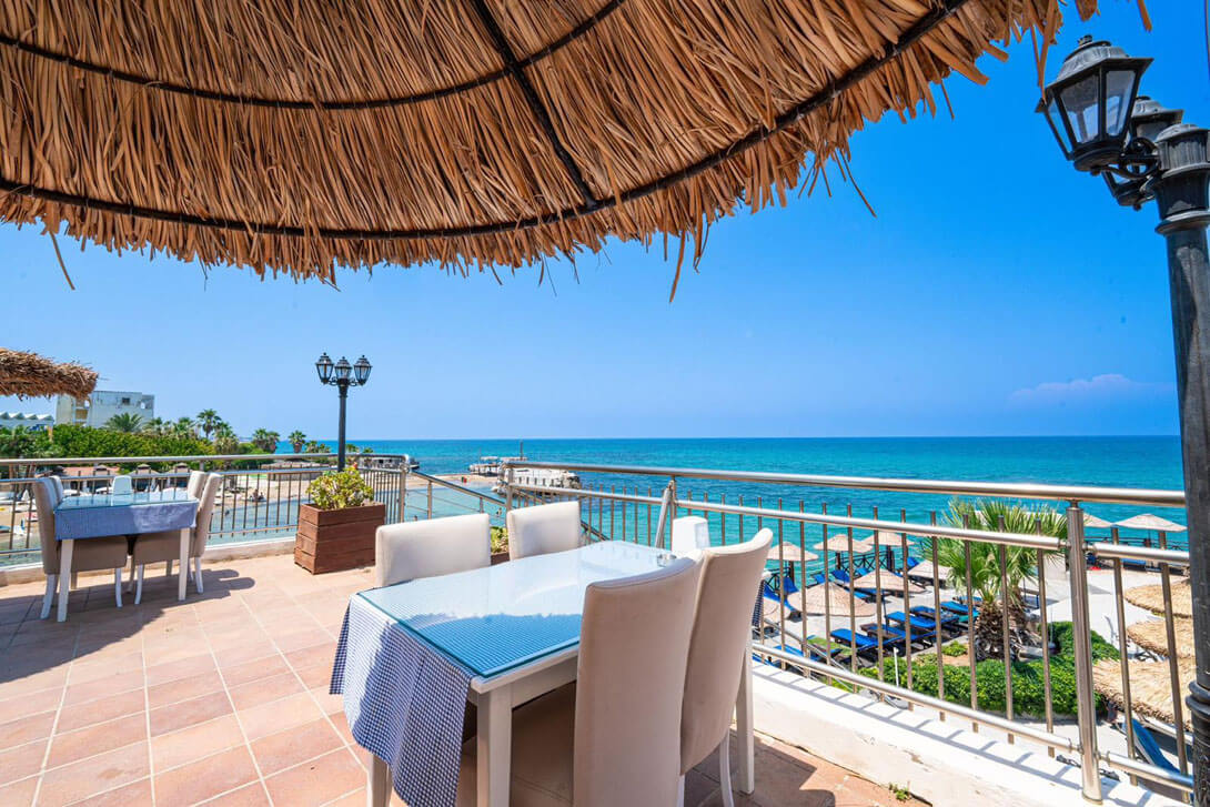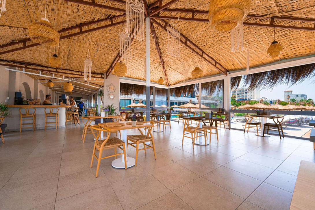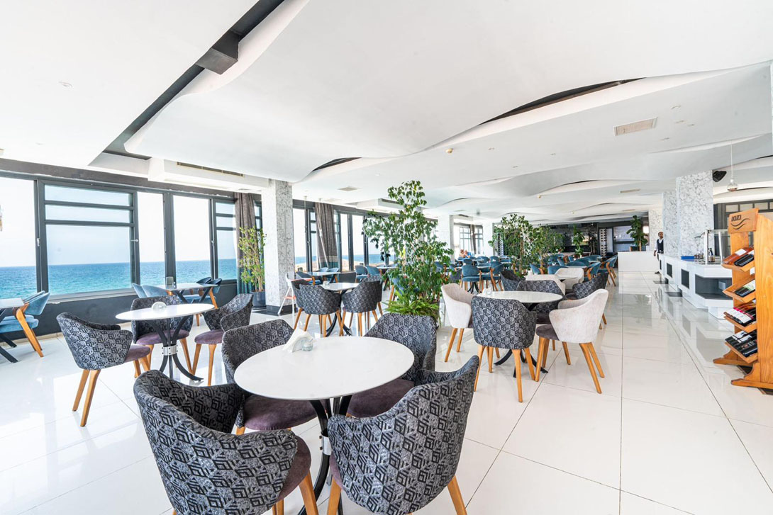 The hotel has an attractive restaurant with large landscape windows looking over the sea. It’s spacious indoor and outdoor areas allow guests to enjoy a relaxed, coastal dining experience, consisting of excellent Cypriot and international cuisine, as well as vegetarian varieties. The Hotel has an American Bar on the terrace offering a full selection of popular drinks and liqueurs. Breakfast is served in the in the main hotel building as an open buffet. Those on half board have open buffet meze and a choice of main courses from a set menu for their evening meal.
