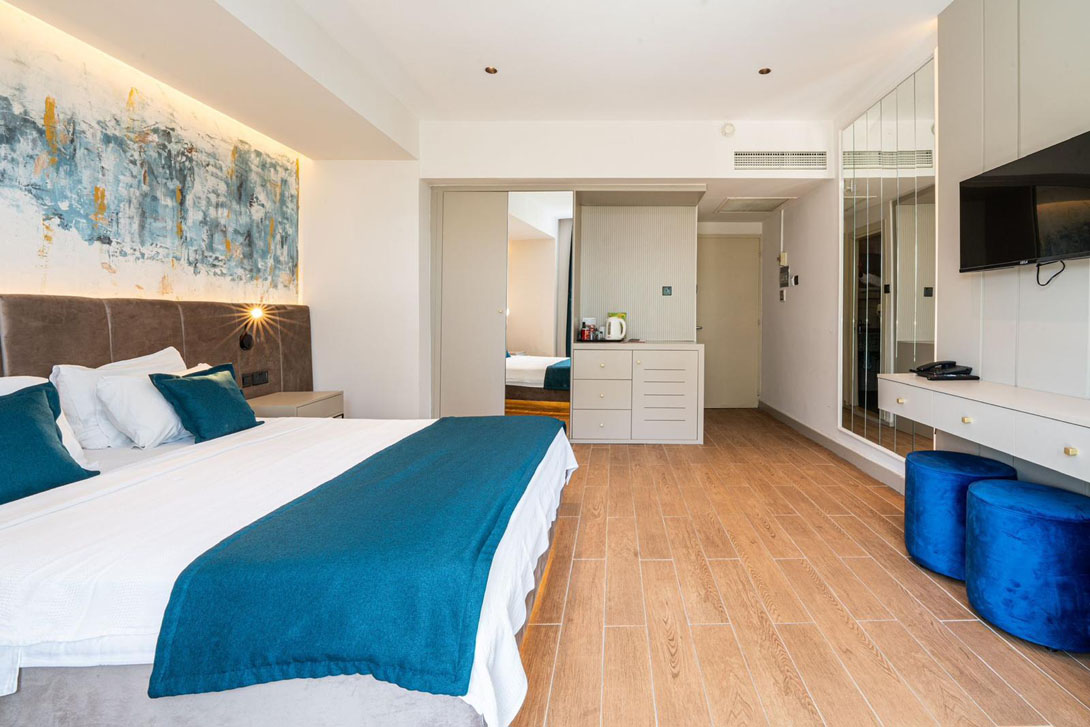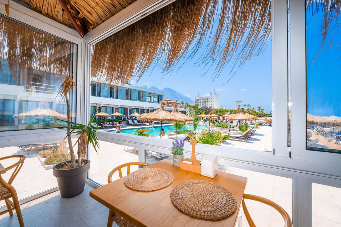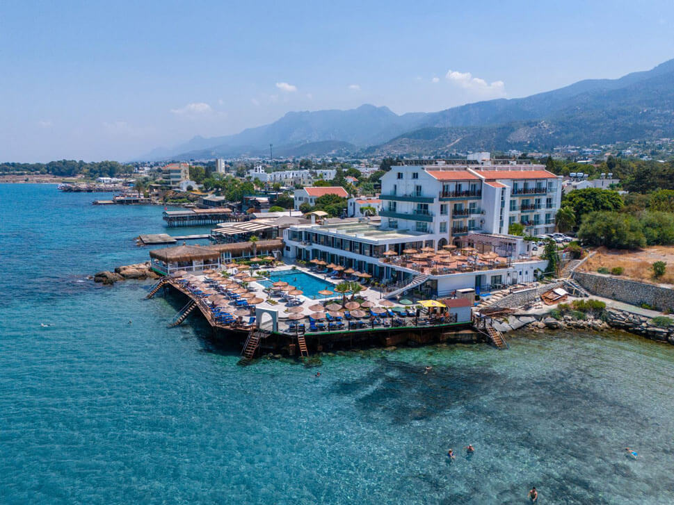 The hotel is situated away from the hustle and bustle of Kyrenia, but with enough amenities in its vicinity to keep you entertained as well as enjoy lying back in spacious and comfortable facilities and leaving the rest of the world behind! Their raised seafront terrace with a large pristine pool equipped with comfortable sun loungers and umbrellas, modern decking sunbathing area and cosy grassed bays around a quaint sea cove, leaves you with just the decision of choosing the perfect spot to hibernate!