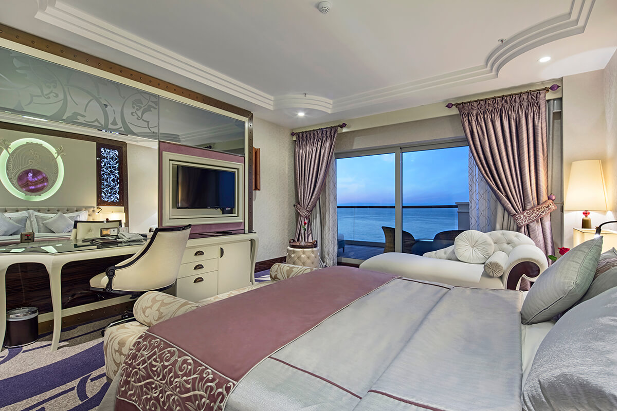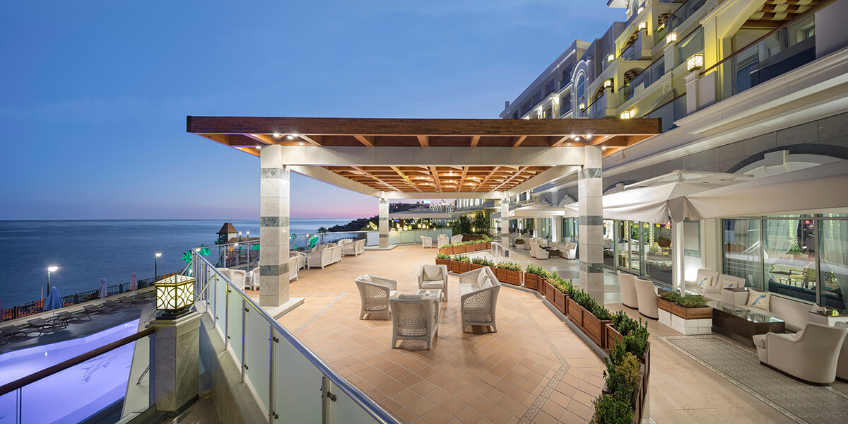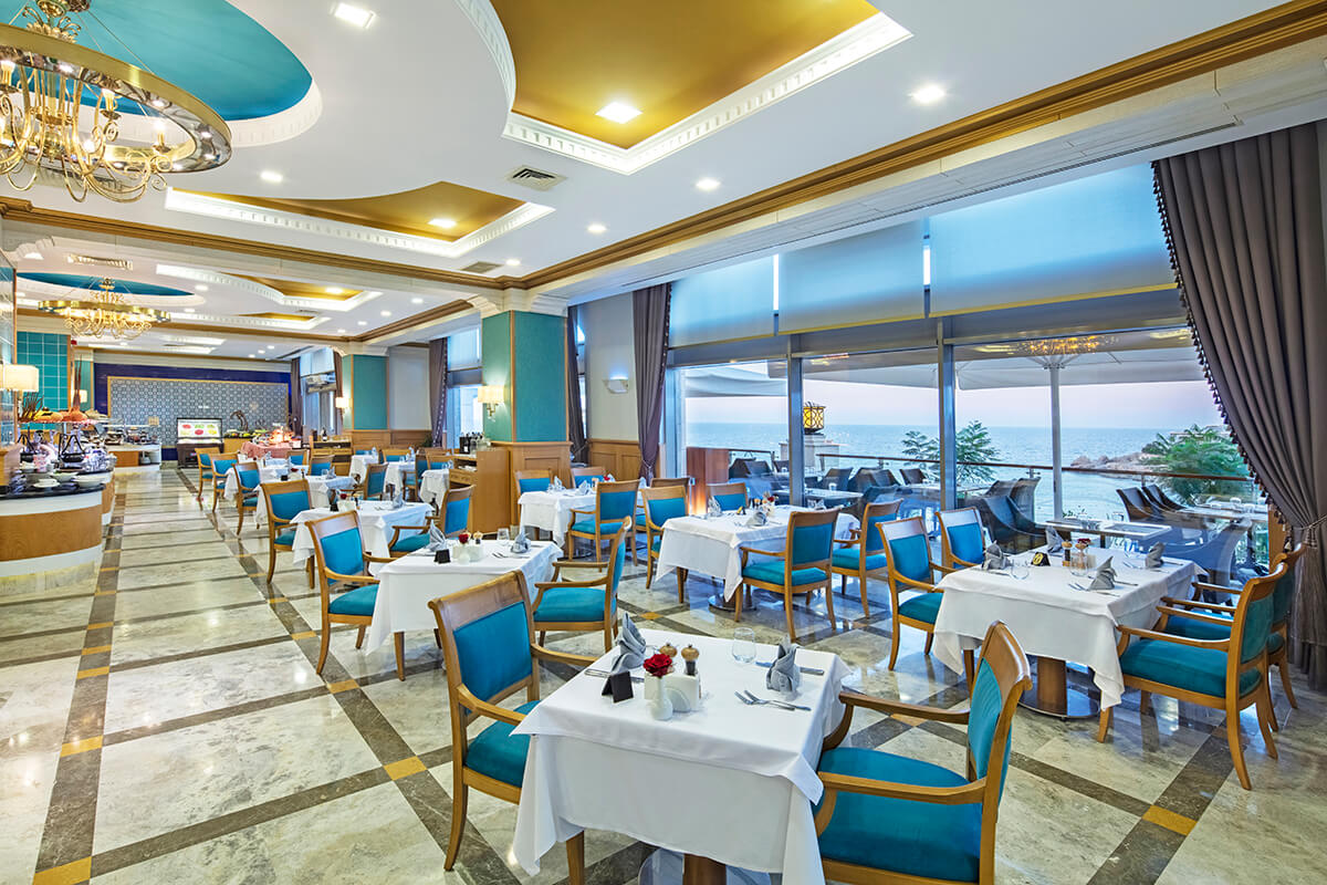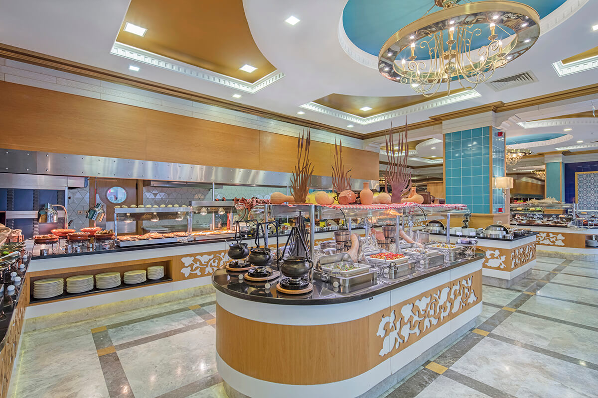 • Buffet breakfast, lunch & dinner with unlimited alcoholic and non-alcoholic drinks to accompany meals. • Soft Buffet at the Spa Cafe at selected times. • Late afternoon Tea Time in the Premium & Royal Lobby. • Alcoholic and non-alcoholic drinks are served at selected times from the Lobby all year round (The Hotel Management assign the beverage list). • Local Alcoholic and non-alcoholic drinks are served at selected times from the Pool & Beach Bars in summer (The Hotel Management assign the beverage list). • One minibar included a day • Late afternoon Tea Time in the lobby Additional Information • Extra Supplements and reservations are required for dinner at the A La Carte Restaurants: Dragon Restaurant, Blue Sea Restaurant, A La Turca, Bella Merit. • Room Service is chargeable. • Mini Bar is chargeable.