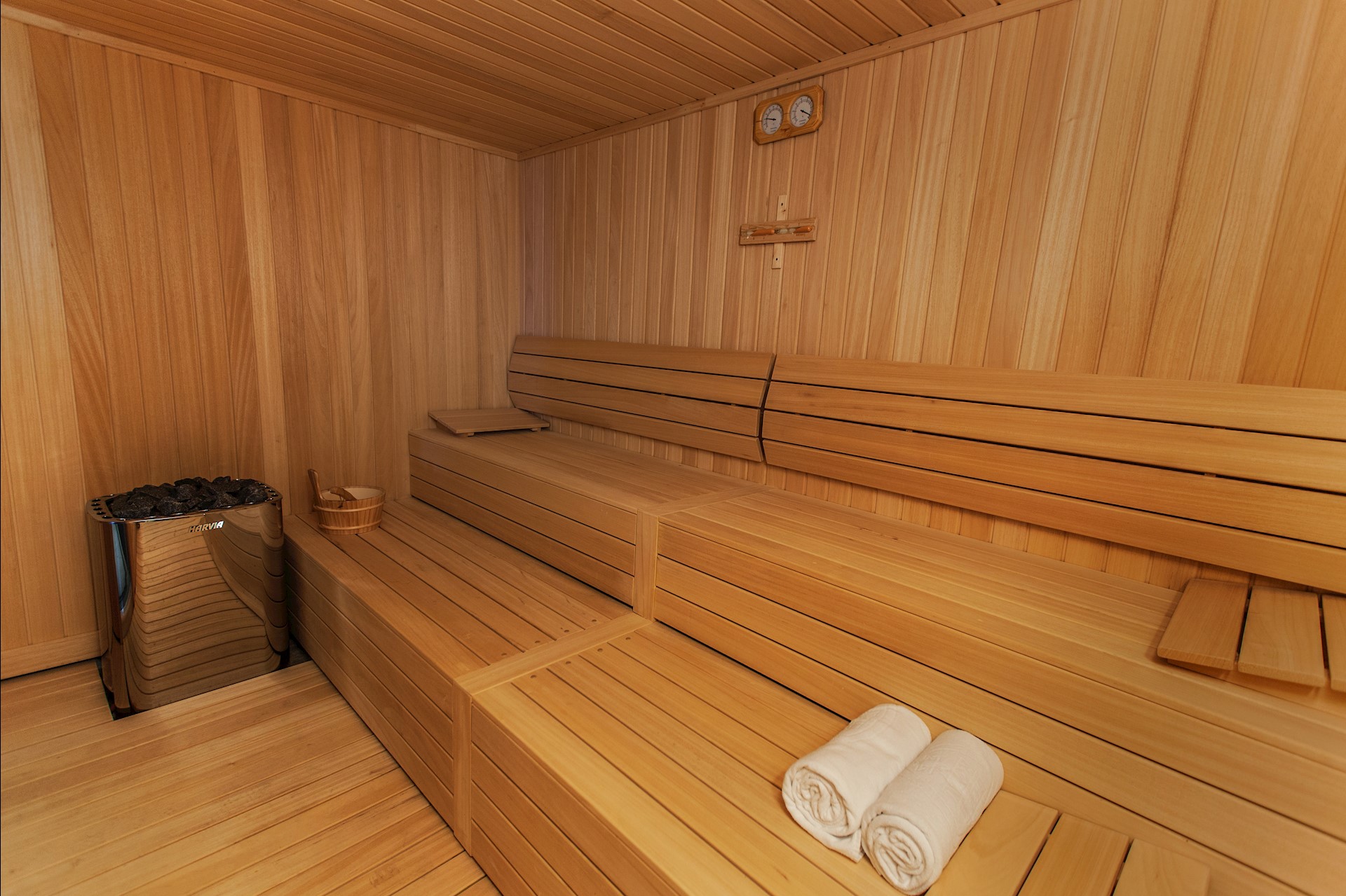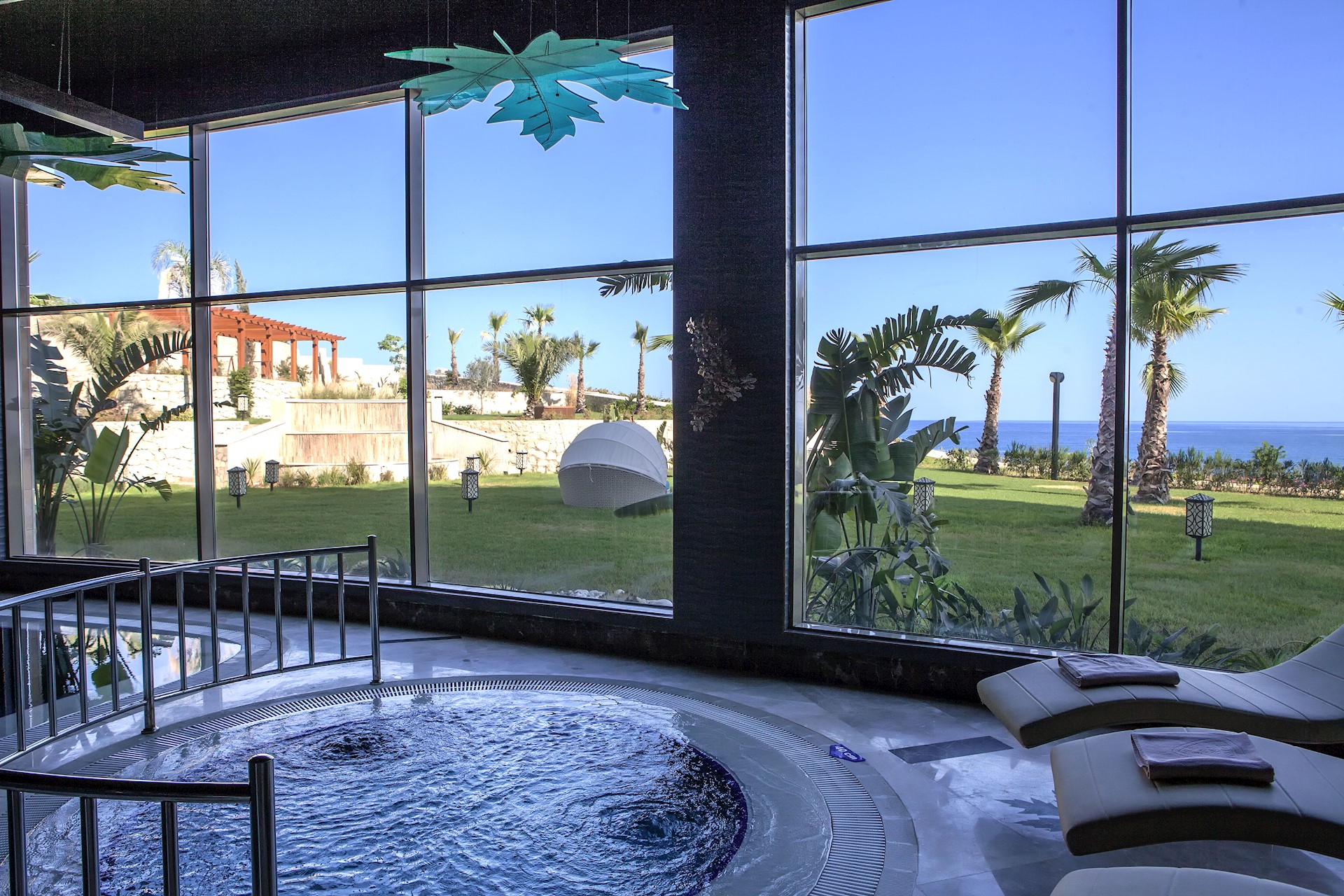 The exquisitely designed outdoor swimming pool area is spacious and decorated with huge stone arches. Its elegantly curved pristine infinity pool offers outstanding views and presents a centre piece in itself when it is beautifully floodlit at night. The sparkling indoor pool also offers an amazingly soothing experience, with its cosy and intimate surroundings and glass walls with stunning views out to the sea.